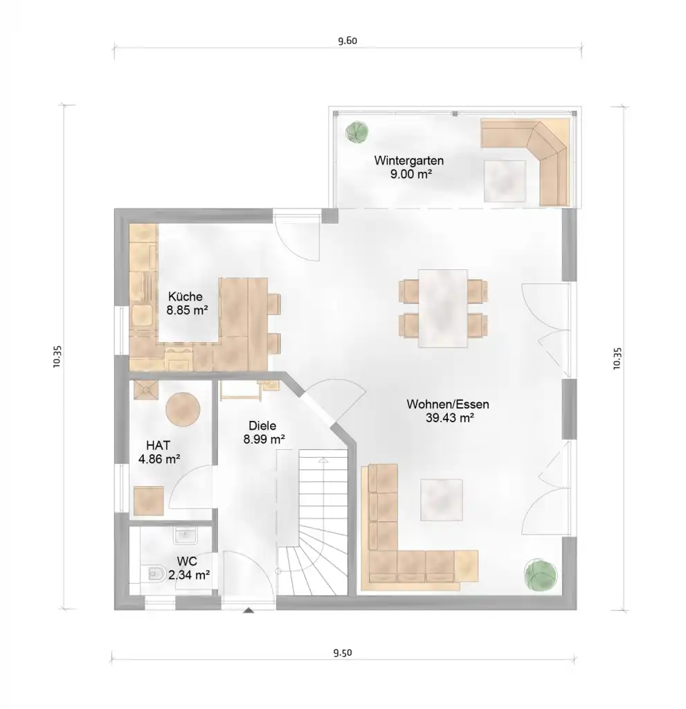 Klassische Architektur gepaart mit modernen Stilelementen lässt Ihr neues Traumhaus zum Hingucker werden. Die funktionellen Grundrisse im Erd- und Dachgeschoss runden dabei das Gesamtpaket auf 123 m² Wohnfläche ab. Im Erdgeschoss befindet sich ein großzügiges Wohnzimmer mit Blick auf den Wintergarten. Dieser lädt zum träumen ein. Im Obergeschoss befinden sich zwei Kinderzimmer, die wahlweise auch als Arbeitszimmer genutzt werden können, sowie ein großes Bad und das Schlafzimmer. Dabei können die Grundrisse natürlich noch variabel an Ihre Wünsche und Bedürfnisse angepasst werden. Ob vier oder fünf Zimmervariante, klassische Grundrissvariationen oder modernes offenes Wohnen.