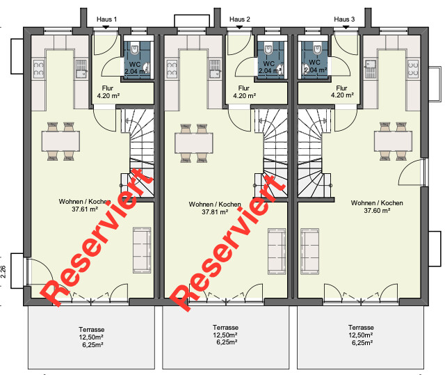 Die Einrichtungsgegenstände und Bodenbeläge (außer Bodenbeläge in Bad und WC) sind nicht in unseren Leistungen enthalten und müssen, wenn gewünscht, extra bestellt werden.